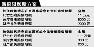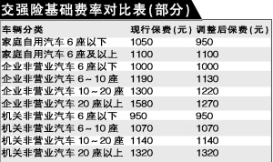 目前,初步方案定為:在12萬元責任限額下,交強險基礎費率按車型不同將有不同幅度的下調(diào),8大類42種車型中將有16種下調(diào)基礎費率,降幅從5%~33%不等,其中普通家庭用車的交強險保費擬由現(xiàn)行的1050元下調(diào)至950元,降幅9.5%,而賠償限額提高一倍,從現(xiàn)行6萬元提高至12萬元。