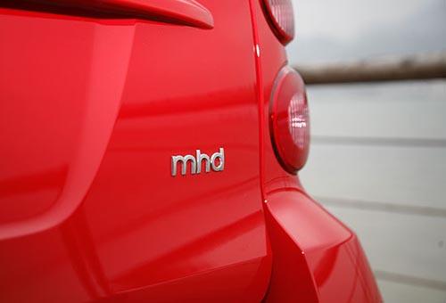 在試車組拍照的空檔,里里外外檢視了Fortwo mhd一番。在外觀部分,車門上的micro hybrid drive彩繪在一路上吸引了不少旁人的目光。其他方面除車尾右側(cè)的mhd字樣銘牌之外,與現(xiàn)行的車款其實并沒有明顯的差異可供辨別。