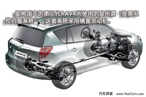 但值得注意的是,之前兩代RAV4采用的都是全時四驅(qū)系統(tǒng),與此相配合發(fā)動機(jī)也使用了縱置的設(shè)計。而即將國產(chǎn)的第三代RAV4所使用的是所謂“按需電控四驅(qū)系統(tǒng)”(Electronic On-DeMand 4-wheel drive)。這套系統(tǒng)采用橫置發(fā)動機(jī),在需要時通過液力粘性耦合器將動力傳至后輪。