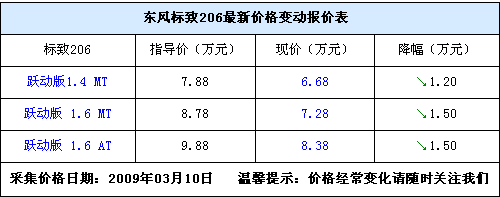就在東風(fēng)標(biāo)致推出207車型的同時,標(biāo)致206車型也隨之停產(chǎn)。近日,我們從北京地區(qū)的部分東風(fēng)標(biāo)致4S店處獲悉,現(xiàn)在標(biāo)致206正在清理庫存,優(yōu)惠較大,目前206僅有3款車型有現(xiàn)車,分別是躍動版1.4手動,躍動版1.6手動和自動,現(xiàn)車最高優(yōu)惠1.5萬元元,售價分別為6.68萬,7.28萬和8.38萬元,現(xiàn)車比較充足,感興趣的朋友可以到店看車,價格還能有所降低。詳情請見下表。