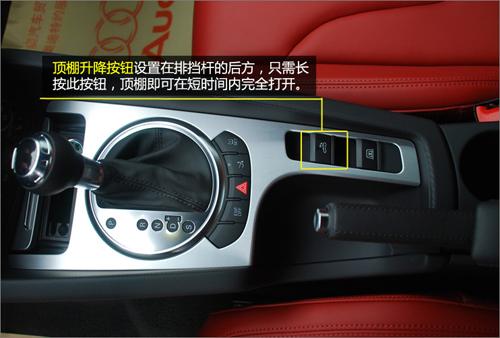 開啟軟頂?shù)陌粹o在變速桿的后方位置。該按鈕的形狀與普通的車窗升降按鈕無(wú)異,而實(shí)際操作的方法也一模一樣。只需長(zhǎng)按該按鈕20余秒,頂棚即可完全放下。藍(lán)天白云就在頭頂?shù)母杏X真好。