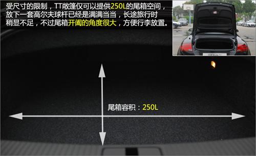 受到車身和軸距尺寸的限制,TT敞篷僅可以提供250L的尾箱空間,與奔馳SLK相比,少了50L。放下一套高爾夫的球桿已經(jīng)是滿滿當(dāng)當(dāng),長途旅行時(shí)稍顯不足。不過尾箱的開闔角度很大,方便行李的放置。