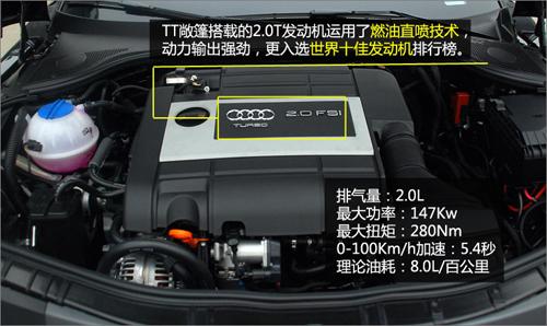 我們實(shí)拍的這臺奧迪TT敞篷采用渦輪增壓器和FSI燃油直噴技術(shù)的2升4缸發(fā)動(dòng)機(jī)。它可輸出147千瓦的功率,產(chǎn)生280牛米的扭矩,并保持轉(zhuǎn)速范圍在1800-5000轉(zhuǎn)/分鐘之間。值得一提的是,這款高效而節(jié)能的發(fā)動(dòng)機(jī)入選2009年Wards Auto的“世界十佳發(fā)動(dòng)機(jī)”排行榜,實(shí)力毋庸置疑。