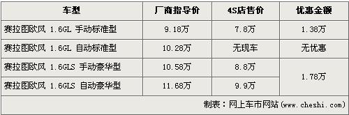 據(jù)經(jīng)銷商處銷售人員介紹,賽拉圖歐風(fēng)全系最高出現(xiàn)1.78萬元的優(yōu)惠。賽拉圖歐風(fēng)在售的有4個(gè)車型,入門級的1.6L手動(dòng)標(biāo)準(zhǔn)版經(jīng)1.38萬元的優(yōu)惠后,售價(jià)從廠商指導(dǎo)價(jià)9.18萬元降到7.8萬元,1.6L豪華版的手動(dòng)版和自動(dòng)版車型都經(jīng)全系最高1.78萬元優(yōu)惠后,售價(jià)分別降至8.8萬元和9.9萬元。經(jīng)銷商處銷售人員還介紹,由于1.6L自動(dòng)標(biāo)準(zhǔn)型沒有現(xiàn)車所以沒有在此次優(yōu)惠的列隊(duì)中,其他車型店內(nèi)現(xiàn)車充足。