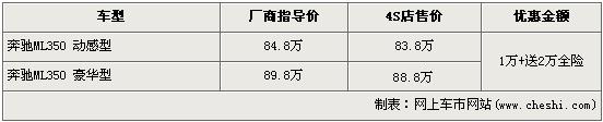 記者目前北京地區(qū)奔馳經(jīng)銷店了解到,現(xiàn)在購買奔馳ML350動感版和豪華型的消費者都可享受現(xiàn)金1萬元的優(yōu)惠,并且購車的消費者還可獲得4S店贈送的全車的保險,價值2萬元左右。銷售人員還介紹,目前4S店內(nèi)沒有奔馳ML現(xiàn)車供應(yīng),欲購買車需等待一個月左右方可提車。