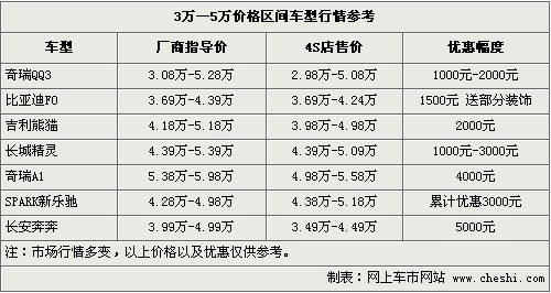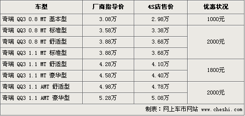 據(jù)4S店銷售人員介紹,目前QQ3的優(yōu)惠幅度在1000元-2000元之間,優(yōu)惠形式各4S店有一定的差別,主要以現(xiàn)金優(yōu)惠和贈(zèng)送裝飾為主。目前最QQ3最便宜車型價(jià)格已經(jīng)不足3萬元,最為一款都市時(shí)尚代步工具而言,這樣的價(jià)格非常的實(shí)惠,F(xiàn)車方面,QQ3有多種顏色可選,消費(fèi)者可到店看車選購。