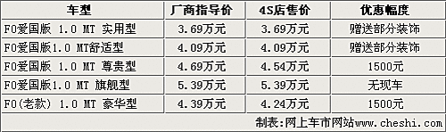 據(jù)比亞迪汽車4S店銷售人員介紹,現(xiàn)在比亞迪F0愛國版igo系列車型的現(xiàn)車比較齊全,只有旗艦型沒有現(xiàn)車,但消費(fèi)者可以預(yù)訂。售價(jià)3.99萬元的老款舒適型現(xiàn)在已經(jīng)停產(chǎn),而老款豪華型目前還有部分現(xiàn)車銷售。另外,比亞迪FO老款豪華型和尊貴型目前都可以優(yōu)惠現(xiàn)金1500元,實(shí)用型和新舒適型只可以贈(zèng)送部分裝飾。