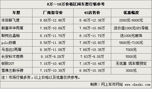 三、8萬—10萬之間匯集了眾多明星級(jí)車型,也是眾多合資品牌競(jìng)爭(zhēng)最為激烈的陣地。新上市的新嘉年華兩廂、斯柯達(dá)晶銳、標(biāo)致207都是最好的證明。這個(gè)區(qū)間車型外觀亮眼個(gè)性,內(nèi)飾空間和操控性各方面表現(xiàn)各異。新飛度、雨燕省油好看,馬自達(dá)2、勁情操控不錯(cuò),嘉年華和晶銳期待在市場(chǎng)上有更好的表現(xiàn),每款車各有所長(zhǎng),跑在大街上絕對(duì)是一道靚麗的風(fēng)景。