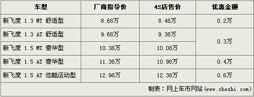 據(jù)廣州本田北京地區(qū)4S店銷售人員介紹,新飛度 1.5L炫酷運(yùn)動(dòng)版的優(yōu)惠金額為6000元。新飛度在售車型分為1.3L及1.5L共5個(gè)車型在售,1.3L手動(dòng)舒適版的優(yōu)惠金額為2000元,現(xiàn)售價(jià)為8.48萬元。1.3L自動(dòng)舒適版的優(yōu)惠金額為3000元,現(xiàn)售價(jià)為9.38萬元。1.5L豪華版的手動(dòng)和自動(dòng)車型經(jīng)4000元優(yōu)惠后,現(xiàn)售價(jià)分別為10.08萬元和10.98萬元,1.5L炫酷運(yùn)動(dòng)版的優(yōu)惠6000元,現(xiàn)售價(jià)為12.38萬元。銷售人員還介紹,目前1.3L的車型店內(nèi)無現(xiàn)車,欲購(gòu)買車需交1000元訂金,約等半個(gè)月才可提車。