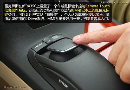 雷克薩斯在新RX350上設(shè)置了一個(gè)車載鼠標(biāo)鍵來控制最新的Remote Touch信息操作系統(tǒng)。該按鈕的功能和操作方法與IBM筆記本上的紅色光標(biāo)鍵類似,可以讓用戶實(shí)現(xiàn)“盲操作”。只需輕輕擺動(dòng)該按鈕,車載電腦屏幕上的鼠標(biāo)鍵便會(huì)按照指示移動(dòng)。個(gè)人認(rèn)為此按鈕要比寶馬、奧迪品牌使用的I-Dirve系統(tǒng)、MMI系統(tǒng)好用一些,初學(xué)者也容易入門。據(jù)悉,這套控制系統(tǒng)將逐步推廣到雷克薩斯全系車型上。