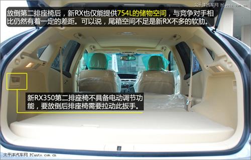 即使放倒了第二排座椅,新RX也只能提供754L的儲(chǔ)物空間,與一種德、美系車(chē)型動(dòng)輒超過(guò)1500L的后排儲(chǔ)物空間相比,仍然有著一定的差距。可以說(shuō),偏小的儲(chǔ)物空間是新RX350上不多的軟肋。