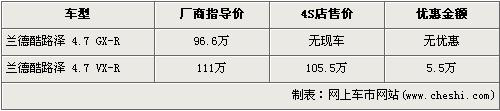 據(jù)經(jīng)銷商銷售人員介紹,豐田-蘭德酷路澤分為4.0L和4.7L兩種排量,由于4.0L車型的尾氣排放是歐III標(biāo)準(zhǔn),沒有達(dá)到北京施行的歐IV標(biāo)準(zhǔn),所以北京限賣,店內(nèi)沒有4.0L車型。4.7L車型分為GX-R版和VX-R版,目前低配的4.7L GX-R車型沒有現(xiàn)車,所以不在此次優(yōu)惠的行列中。高配的VX-R版經(jīng)5.5萬元優(yōu)惠后的售價(jià)也降到了105.5萬元。