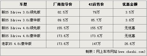 據(jù)經(jīng)銷商處銷售人員介紹,近期購買X5的消費(fèi)者可以得到最高26.6萬元的優(yōu)惠。新款的寶馬X5 3.0L車型目前有買車送一半購置稅的活動,購置稅優(yōu)惠的價(jià)值可以直接抵車價(jià),經(jīng)抵價(jià)轉(zhuǎn)換后,新X5 3.0i領(lǐng)先版和豪華版經(jīng)3.5及3.8萬元優(yōu)惠后售價(jià)降為了79萬元和85.7萬元,新寶馬X5 4.8i車型目前仍然沒有優(yōu)惠。銷售人員就介紹,老款的X5 4.8i豪華版有26.6萬元的高額優(yōu)惠,售價(jià)從173.6萬元降到了147萬元。