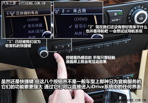 還有一點比較有意思的是,寶馬5系的中控臺面板上DVD槽下方帶有8個快捷鍵,一般來說這些快捷鍵是服務(wù)于音響系統(tǒng),用來存儲電臺或選擇CD的,但在這里它們的功能要比我們想象中的更強大。當我們停留在任何iDrive系統(tǒng)界面時,都可以通過長按一個快捷鍵來將該界面存儲下來,舉個例子,當我在iDrive系統(tǒng)中調(diào)節(jié)到“已存儲電臺”這個界面時,我長按快捷鍵1就可以將“已存儲電臺”界面存儲下來,以后如果我想調(diào)出“已存儲電臺”界面時只要按下快捷鍵1就行了,非常方便。