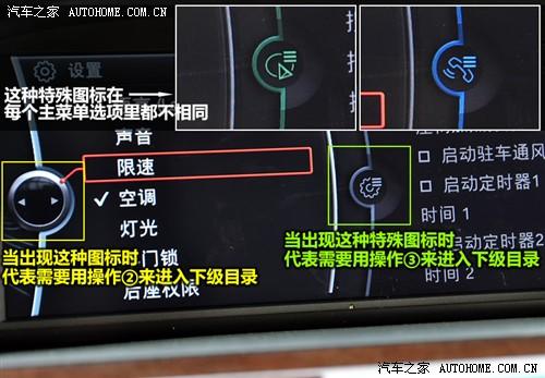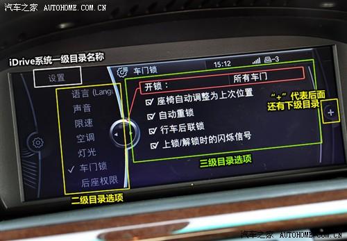 當我們進入“設(shè)置”選項的二級目錄時,在二級目錄的左右兩邊我們可以看到兩種不同的圖標。左邊的圓形帶有兩個小箭頭的圖標表示如果想進入左側(cè)的上級目錄需要使用②撥動方式向左撥動旋鈕進入,而右邊的特殊圖標表示如果想進入右側(cè)的下級目錄需要使用③向下按的方式進入?偟膩碚f,這種左右分列的目錄形式比老款要更符合人們的日常習(xí)慣,因此比老款iDrive系統(tǒng)更容易得到用戶的認可。