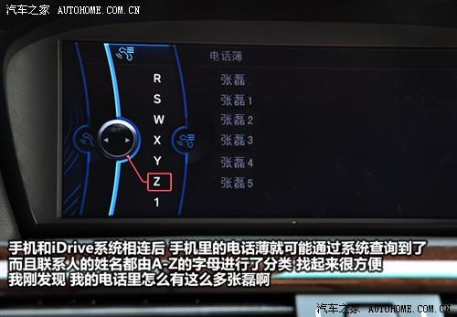 藍牙免提系統(tǒng)是強調(diào)豪華的車型上的必備配置,在此我們也通過iDrive系統(tǒng)進行了一次和手機相連的操作。和一般車型上的一樣,iDrive系統(tǒng)提供的藍牙免提也需要查找、配對、連接三個步驟才能和手機相連,整個過程清晰易懂,只要按照提示操作就沒有任何難度可言。相連后手機內(nèi)的電話薄可以通過iDrive系統(tǒng)查詢到,而且電話薄里聯(lián)系人的姓名都按A-Z字母進行了分類,用起來比較方便。