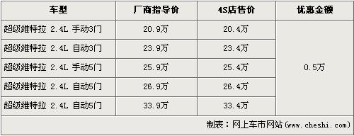 據(jù)4s店銷售人員介紹,目前店內(nèi)銷售的新超級(jí)維特拉全系優(yōu)惠5000元。低配的3門版2.4L 5速手動(dòng)車型最低售價(jià)降為20.4萬元,而排量稍大采用5速自動(dòng)變速器的5門版3.2L車型經(jīng)優(yōu)惠后售價(jià)也降為33.4萬元,是全系最高價(jià)。店內(nèi)現(xiàn)車顏色方面,新超級(jí)維特拉有黑、灰、白三個(gè)顏色供消費(fèi)者選購。