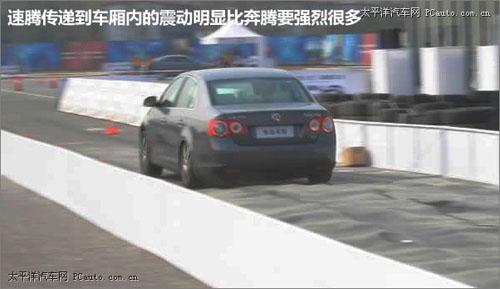 濕滑路面體驗這個項目主要是模擬冰雪路面的對于車輛的操控,在光滑的鋼板上潑上水附著力減小,在通過彎道時速騰依舊過早的出現(xiàn)轉(zhuǎn)向不足的情況,不過方向盤的指向依舊保持的較為精準(zhǔn)。奔騰在高速過彎時側(cè)傾要小于速騰,不過路感不是特別清晰,電子穩(wěn)定系統(tǒng)起到的作用非常明顯,底盤在舒適性和運動性間找到了平衡點。