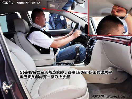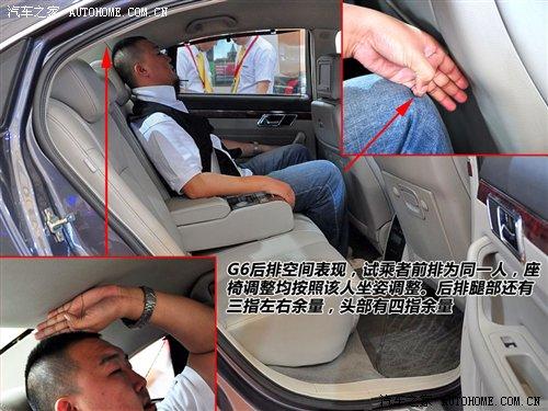 對于這種大尺寸車型最慣性的思路是感受它的空間。G6前排坐進(jìn)180cm以上乘客時,頭部還有一拳以上余量。同一個人體驗(yàn)后排,腿部三指、頭部四指的空間余量只能說比較一般。