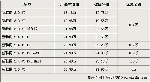 據(jù)4S店銷售人員介紹,目前新雅閣全系優(yōu)惠最高達(dá)到了4萬元。新雅閣分為2.0、2.4、3.5三個(gè)排量,全系最低配的2.0手動(dòng)版經(jīng)4000元優(yōu)惠后售價(jià)降到了17.78萬元,2.4L車型高配的EXL NAVI版經(jīng)1.3萬元優(yōu)惠后售價(jià)降到了25.18萬元,而3.5排量車型優(yōu)惠4萬元達(dá)到了全系的最高。銷售人員還介紹,除了最低配的車型無現(xiàn)車外,其他車型均有現(xiàn)車。
