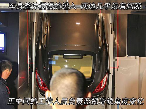 再快將車身完全吊起之前,一直都由一名工作人員監(jiān)視著滑軌和運輸架的動作,并監(jiān)控著車身與電梯兩側(cè)的距離?粗嚿砺耐耆M入電梯內(nèi),想必工作人員的心都在逐漸放松吧。
