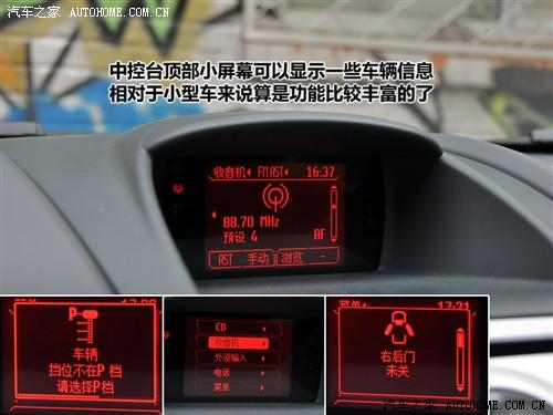 中控臺頂部的顯示屏雖然很小,但是在小型車中還是不多見的,而且功能也比較豐富,包括時間、音頻、車輛信息和一些簡單功能設置。比如可以調節(jié)音效,收音機的選臺存臺,CD播放等,基本上以音頻信息為最有用的。此外,還有車輛警示信息,比如車門未關、自動擋擋位沒在P擋等,而且警示信息顯示時還有紅色進度條一直在行進,進度條結束了信息也就不顯示了。