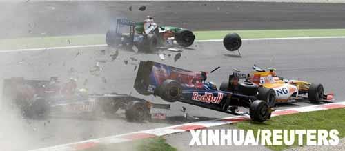 5月10日,紅牛二隊(duì)車手布爾代(前中)和隊(duì)友布埃米(前左)以及印度力量車隊(duì)車手蘇蒂爾(后)、雷諾車隊(duì)車手皮蓋駕駛的賽車發(fā)生碰撞。當(dāng)日,F(xiàn)1西班牙大獎(jiǎng)賽落幕,布朗GP車隊(duì)的英國(guó)車手巴頓奪得冠軍。新華社/路透