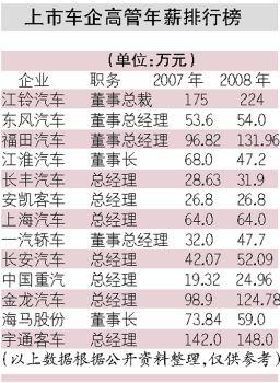 4月底所有上市車企披露了2008年年報(bào),高管薪酬也浮出了水面。2008年并不算是個(gè)好的年份,上半年市場(chǎng)尚好但遭遇了成本高漲的壓力,下半年市場(chǎng)急劇降溫,企業(yè)利潤(rùn)也快速下滑。但上市公司高管的薪酬基本上還是穩(wěn)中有升,當(dāng)然,與2007年同比2006年的大幅增長(zhǎng)不可同日而語。商用車企業(yè)的薪酬要遠(yuǎn)高于乘用車車企高層,高管薪酬超過100萬元的全是商用車企業(yè)。