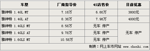 筆者從北京地區(qū)經(jīng)銷商處了解到,目前雅紳特各4S店均沒有現(xiàn)車供應(yīng),需要預(yù)訂,訂金需要交納1000元左右,15個工作日內(nèi)可以交車。雅紳特共有五款車型,但目前在售的只有1.4手動標(biāo)準(zhǔn)和自動標(biāo)準(zhǔn)兩款,車價方面,這兩款可分別優(yōu)惠3800元和4000元,其他三款據(jù)銷售人員介紹,均已經(jīng)停產(chǎn)。