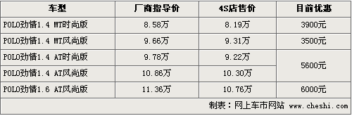 據(jù)4S店銷售人員介紹,目前POLO勁情現(xiàn)車比較緊張,只有少數(shù)車型有現(xiàn)車供應(yīng),同時各款車型在價格上的優(yōu)惠幅度也不一樣。1.4入門級車型優(yōu)惠現(xiàn)金3900元,其他各款優(yōu)惠從3500元-6000元不等。另據(jù)銷售人員介紹,消費者如果預(yù)訂車型的話,需要先交訂金排隊,一個月左右才能順利提到車現(xiàn)車。