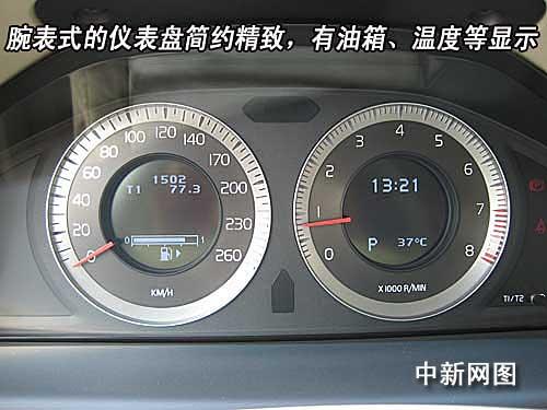腕表式的儀表盤簡約精致,沒有炫麗的燈光效果,看上去并不起眼。剩余油量和可行駛里程以數(shù)字方式顯示在車速表中央,當(dāng)前時間、外界氣溫及檔位顯示在轉(zhuǎn)速表中央。所有儀表信息都采用中文顯示。