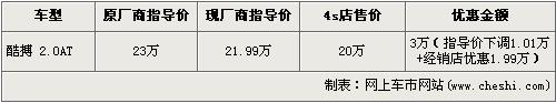 根據(jù)4s店銷售人員介紹,目前官方對(duì)酷博 2.0 AT版車型的廠商指導(dǎo)價(jià)下調(diào)了1.01萬(wàn)元,下調(diào)后廠商指導(dǎo)價(jià)從23萬(wàn)元降到了21.99萬(wàn)元,并且在店內(nèi)購(gòu)車的消費(fèi)者還可以得到經(jīng)銷店送出的1.99萬(wàn)元的優(yōu)惠。經(jīng)總優(yōu)惠后,道奇酷博的售價(jià)降到了20萬(wàn),F(xiàn)車方面,店內(nèi)酷搏現(xiàn)車不多,錯(cuò)過(guò)的消費(fèi)者只能交1萬(wàn)元訂金,下個(gè)月才可提車。