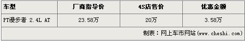 據(jù)北京克萊斯勒經(jīng)銷(xiāo)店銷(xiāo)售人員介紹,近期購(gòu)買(mǎi)PT漫步者的消費(fèi)者可以得到3.58萬(wàn)元的優(yōu)惠。在售的PT漫步者為2.4L自動(dòng)檔車(chē)型,售價(jià)為23.58萬(wàn)元。經(jīng)優(yōu)惠后,PT漫步者的售價(jià)從23.58萬(wàn)元下降到了20萬(wàn)元。銷(xiāo)售人員還說(shuō),店內(nèi)現(xiàn)車(chē)顏色主要是黑色和銀色,欲購(gòu)買(mǎi)其他顏色的消費(fèi)者需交定金1萬(wàn)元,最快下周就可提車(chē)。