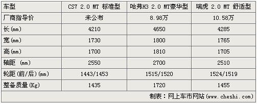 在基本參數(shù)方面,獵豹CS7要比源自轎車平臺的瑞虎還要小一些,車長只有4210mm,但軸距要比瑞虎大一些,當然三款車中哈弗H3明顯要大一號,無論車長還是軸距方面。也就意味著從外觀上看,哈弗H3將很大氣,而獵豹CS7要小巧一些。