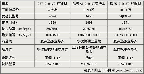 在動力方面,三款車中獵豹只有2.0L排量可選,而哈弗有2.0L、2.4L以及2.8T柴油可選,而瑞虎也有1.6L、1.8L和2.0L 可以選擇,以2.0L的動力對比來看,瑞虎的SQR484F發(fā)動機從數(shù)據(jù)上看最為強勁,而哈弗H3的4G63在低速扭矩方面具有優(yōu)勢。在懸架系統(tǒng)方面,三款車中CS7采用了偏重越野的整體橋式后懸掛,但舒適性上不如另兩款車型。
