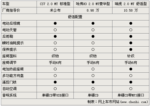 在安全配置,三款車都標配前排雙氣囊、ABS+EBD、側(cè)門防撞梁等安全裝備,但瑞虎的配置無疑是最全的,但售價要比哈弗H3貴近1.6萬元,而獵豹cs7的售價還未公布。倒車雷達、電子防盜等都為CS7標配,但前盤后鼓的剎車設(shè)計讓人有些失望。