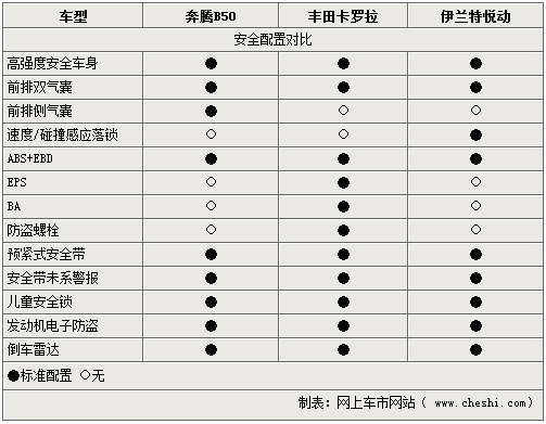 在安全裝備上,奔騰B50五款車型采用的是同樣的配置,前排雙氣囊、駕駛員自動預緊安全帶、駕駛員安全帶未系報警等都為標配,防炫目內后視鏡、后門兒童鎖、間歇式寬幅雨刷都為保障駕駛安全設計。對比另外兩款車型則少了EPS以及BA等輔助安全系統(tǒng)。