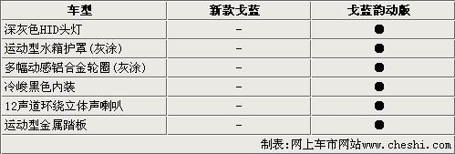 新款戈藍(lán)還增加了戈藍(lán)韻動(dòng)版車(chē)型,這款新車(chē)在整車(chē)的設(shè)計(jì)方面都有新的變化。在外觀方面,戈藍(lán)韻動(dòng)版采用深灰色HID大燈、運(yùn)動(dòng)型灰色涂裝水箱護(hù)罩以及多幅動(dòng)感鋁合金輪轂。內(nèi)飾方面采用了黑色內(nèi)飾風(fēng)格,配備了12聲道環(huán)繞立體聲喇叭和運(yùn)動(dòng)型金屬踏板,使整車(chē)看上去更具運(yùn)動(dòng)氣質(zhì)。