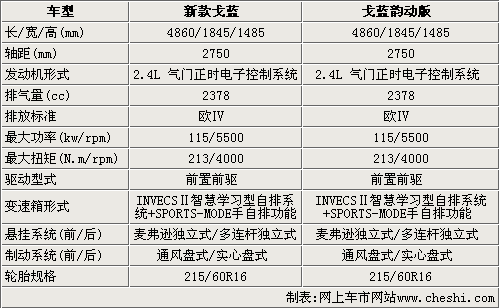 三菱全新戈藍(lán)和韻動(dòng)版的整車(chē)尺寸為4860/1845/1485mm,軸距達(dá)到了2750mm,與雅閣、凱美瑞達(dá)到同一水平。新款戈藍(lán)和韻動(dòng)版搭載2.4L發(fā)動(dòng)機(jī),最大功率達(dá)到115kw/rpm,最大扭矩為213N.m/4000rpm.,匹配INVECSⅡ智慧學(xué)習(xí)型手自一體變速箱,并配備有換擋撥片功能。戈藍(lán)采用多連桿式后懸掛系統(tǒng),并采用前通風(fēng)盤(pán)式,后實(shí)心盤(pán)式制動(dòng)系統(tǒng),使這款車(chē)更具操控性和安全性。