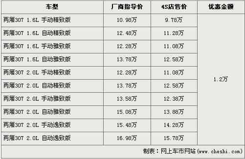 據(jù)東風(fēng)標(biāo)致經(jīng)銷店銷售人員介紹,兩廂標(biāo)致307分為1.6L和2.0L兩種排量,目前優(yōu)惠1.2萬元,入門車型的1.6L 手動精致版原廠商指導(dǎo)價為10.98萬元,經(jīng)優(yōu)惠后僅售9.78萬元,排量稍大的2.0L排量的低配車型手動精致版經(jīng)優(yōu)惠后售價為11.08萬元。現(xiàn)車方面,1.6L車型現(xiàn)車充足,2.0L車型則現(xiàn)車緊張,挑選空間不大。