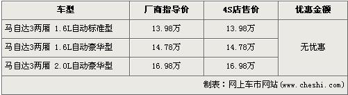 據(jù)經(jīng)銷商處銷售人員介紹:目前店內(nèi)僅馬自達(dá)3兩廂1.6L車型有少量現(xiàn)車,顏色以紅和黑為主。2.0L車型已沒有現(xiàn)車,但4S店接受預(yù)定,不過提車時間不能確定。
