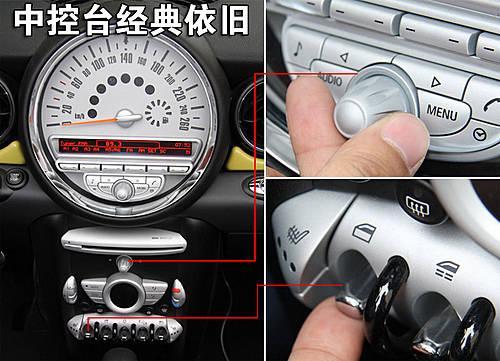 新一代Mini Cooper和Mini Cooper S敞篷版中控臺自上而下依然熟悉的大圓形時速表、音響調(diào)節(jié)按鈕及旋鈕、CD機(jī)頭、自動空調(diào)及車窗和中控門鎖等控制開關(guān),與其它Mini車型如出一轍。