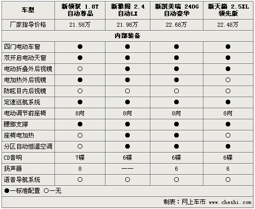 在內(nèi)部裝備方面,四款中級車更是不遺余力的配備各自高端配置,電動天窗、定速巡航、電動座椅、以及自動空調(diào)均稱為四款車的標準配置。但新雅閣、新凱美瑞和新天籟配備的電動折疊外后視鏡,卻沒有出現(xiàn)在新領(lǐng)馭同級車上。此外,新領(lǐng)馭配備的7碟CD和8揚聲器音響系統(tǒng),似乎較其它三款日系車更加悅耳。