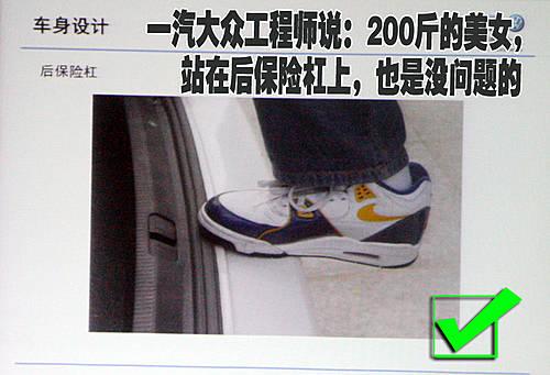 一汽大眾產(chǎn)品部工程師這樣說:“即便一個200斤美女站在我們產(chǎn)品的的后保險杠上,那也是沒有問題的”。雖然我們身邊很少有人去嘗試站在保險杠上,但是這樣的設(shè)計都源自大眾的嚴(yán)謹(jǐn)態(tài)度,在很多時候您的愛車完全可以當(dāng)作一架小梯子去使用。