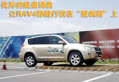 RAV4城市休閑SUV優(yōu)異的底盤調教,使其行駛在模擬“搓板路”上時,車內駕乘人員感覺車兩依然平穩(wěn)舒適。似乎整個RAV4車身懸浮在底盤之上,之間前后懸架在上下調節(jié)從而適應路面狀況。