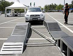 在模擬坑洼路段高低錯落的路面時,通過車輪離地和懸掛扭曲的狀況,可以明顯能感覺到RAV4車身十足的剛性。在一個車輪懸空時,主動扭矩分配4輪驅動系統(tǒng)自動分配動力輸出到著地的車輪,保證車輛正常行駛。此外,可人工控制的差速鎖配合AUTO LSD限滑差速鎖,RAV4在開過這些障礙物時幾乎沒有停頓。