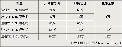 據(jù)經(jīng)銷商銷售人員介紹,目前店內(nèi)途銳全系均有不同優(yōu)惠,最高讓利達到了15萬元。搭載V6發(fā)動機的3.6L車型優(yōu)惠現(xiàn)金6萬元,3.6L車型經(jīng)優(yōu)惠后售價分別為:標(biāo)準(zhǔn)型68萬元,豪華型74萬元,頂級型80萬元;搭載V8發(fā)動機的3.6L頂級型經(jīng)10萬元優(yōu)惠后售價降到了125萬元;搭載W12發(fā)動機的全系頂配車型6.0L頂級版經(jīng)15萬元的優(yōu)惠后售價從180萬降到了165萬元。