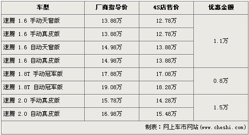 據(jù)北京一汽大眾經(jīng)銷店銷售人員介紹,在上海車展上亮相的速騰1.4TSI最早預(yù)計(jì)將在6月上市銷售,預(yù)售價(jià)格可能不會(huì)低于16萬元,此車的上市將會(huì)取代目前在售的速騰2.0升自動(dòng)擋車型。近期購買速騰在售車型的消費(fèi)者都可以得到不同程度的優(yōu)惠,速騰1.6L車型優(yōu)惠1.1萬元,1.8T冠軍版車型優(yōu)惠8000元,2.0L車型優(yōu)惠金額達(dá)到了全新最高的1.5萬元,但是2.0L車型目前店內(nèi)無現(xiàn)車,預(yù)購買者需交訂金1000元,約等一周后可提車。
