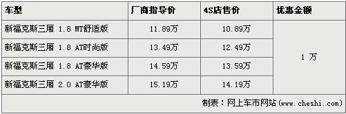 據(jù)長(zhǎng)安福特經(jīng)銷商處銷售人員介紹,兩廂新款?怂谷祪(yōu)惠1萬(wàn)元。兩廂新款福克斯分為1.8L和2.0L兩種排量,入門級(jí)車型的1.8L手動(dòng)舒適版經(jīng)優(yōu)惠后,售價(jià)為10.89萬(wàn)元。高配的2.0L自動(dòng)運(yùn)動(dòng)版售價(jià)降到了14.39萬(wàn)元。
