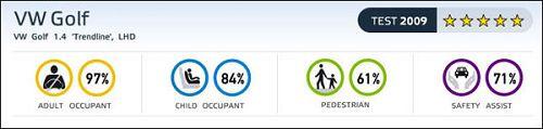 綜合來看,高爾夫6代獲歐洲碰撞測試實驗室5星評價。對成員保護(hù)得分率97%,對兒童保護(hù)得分率84%,對行人保護(hù)得分率61%,安全輔助裝備得分率71%。